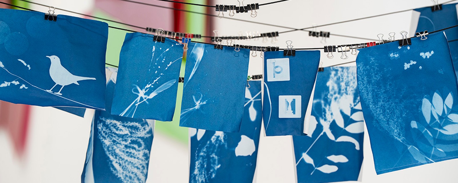 Ein altes fotografisches Verfahren ohne Chemie ist die Cyanotypie. Es entstehen mithilfe einer Speziallampe wunderschöne blaue Blätter.